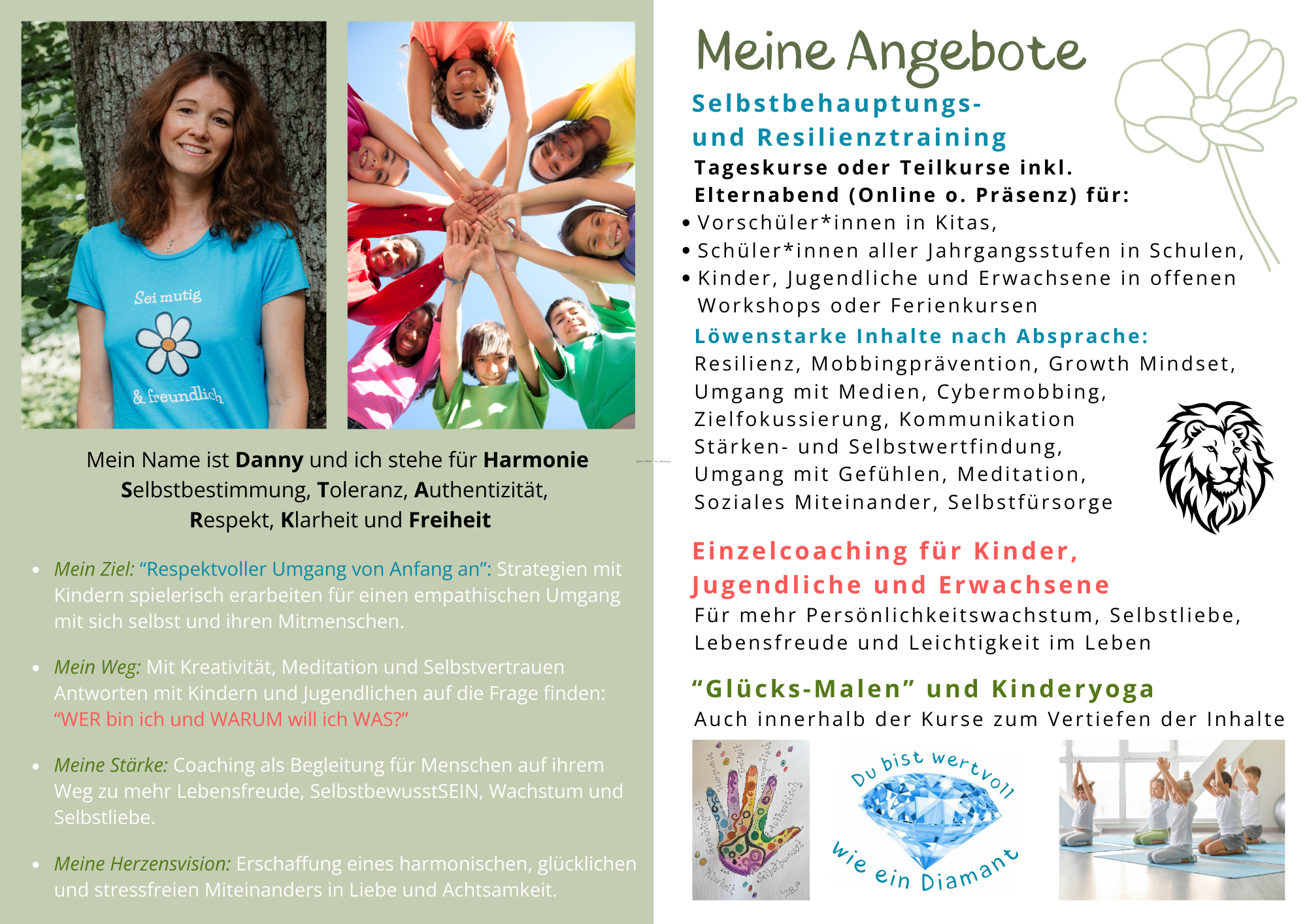 Ich bin absolute Quereinsteigerin, doch meine Herzensvision hat mich motiviert eine Ausbildung zur Selbstbehauptungs- und Resilienztrainerin für Kinder, zur Persönlichkeitstrainerin für Jugendliche, zur Kinder- und Jugendcoach(in) und Meditationscoach(in) zu absolvieren.